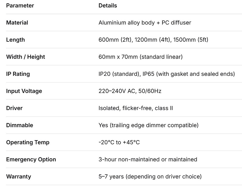 Materjal: tavaliselt ekstrudeeritud alumiinium soojuse hajutamiseks, ühendatud polükarbonaadist difuusoriga. Terasest versioonid on olemas, kuid alumiinium on LED-ide jahedana hoidmise kuldstandard.